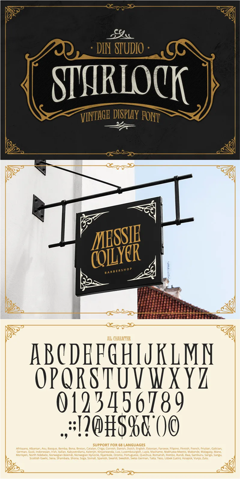 Introducing Starlock – a vintage-inspired display font that blends retro charm with subtle sophistication. Designed in all caps and a moderate weight that strikes a perfect balance between presence and elegance. The consistent letter proportions ensure a harmonious and polished look. Whether you’re aiming for a nostalgic feel or a touch of classic style, Starlock delivers a refined and memorable typographic statement. As an extra, this font gives ornaments. In addition, enjoy the features here.
