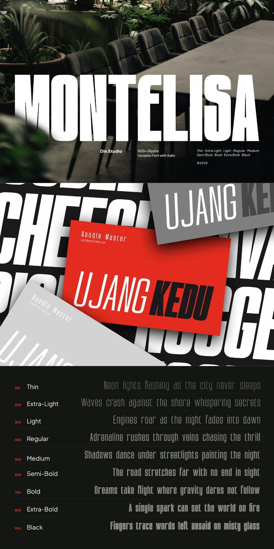 Montelisa is a bold and refined display sans serif font family with tall, clean letterforms and seamless transitions from thin to thick. With 9 powerful weights, italic styles, and full variable font control over weight and slant, Montelisa is built to command attention in the modern graphic design era. In addition, enjoy the features here.