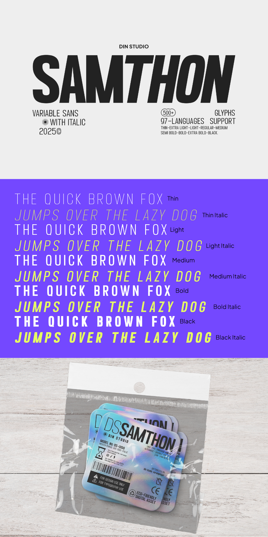 Samthon is a modern neo-grotesque sans serif font family with tall characters, clean letterforms, horizontal terminals, and tight apertures that give it a confident, structured feel. With 9 precise weights, italics, and full variable font support for weight and slant, Samthon is built to greatly impact your design. In addition, enjoy the features here.