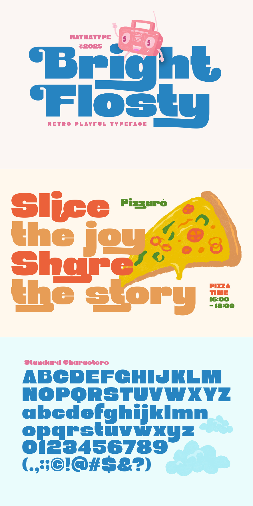 Bright Flosty is a retro display font that bursts with playful charm and bold personality. Its chunky letterforms and lively curves capture the fun-loving spirit of vintage design, making it perfect for projects that need a splash of nostalgia with a modern twist. Designed to grab attention, Bright Flosty shines in design that aims to feel both bold and cheerful. With its eye-catching style and upbeat energy, this font brings a touch of retro fun to any creative work. In addition, enjoy the features here.