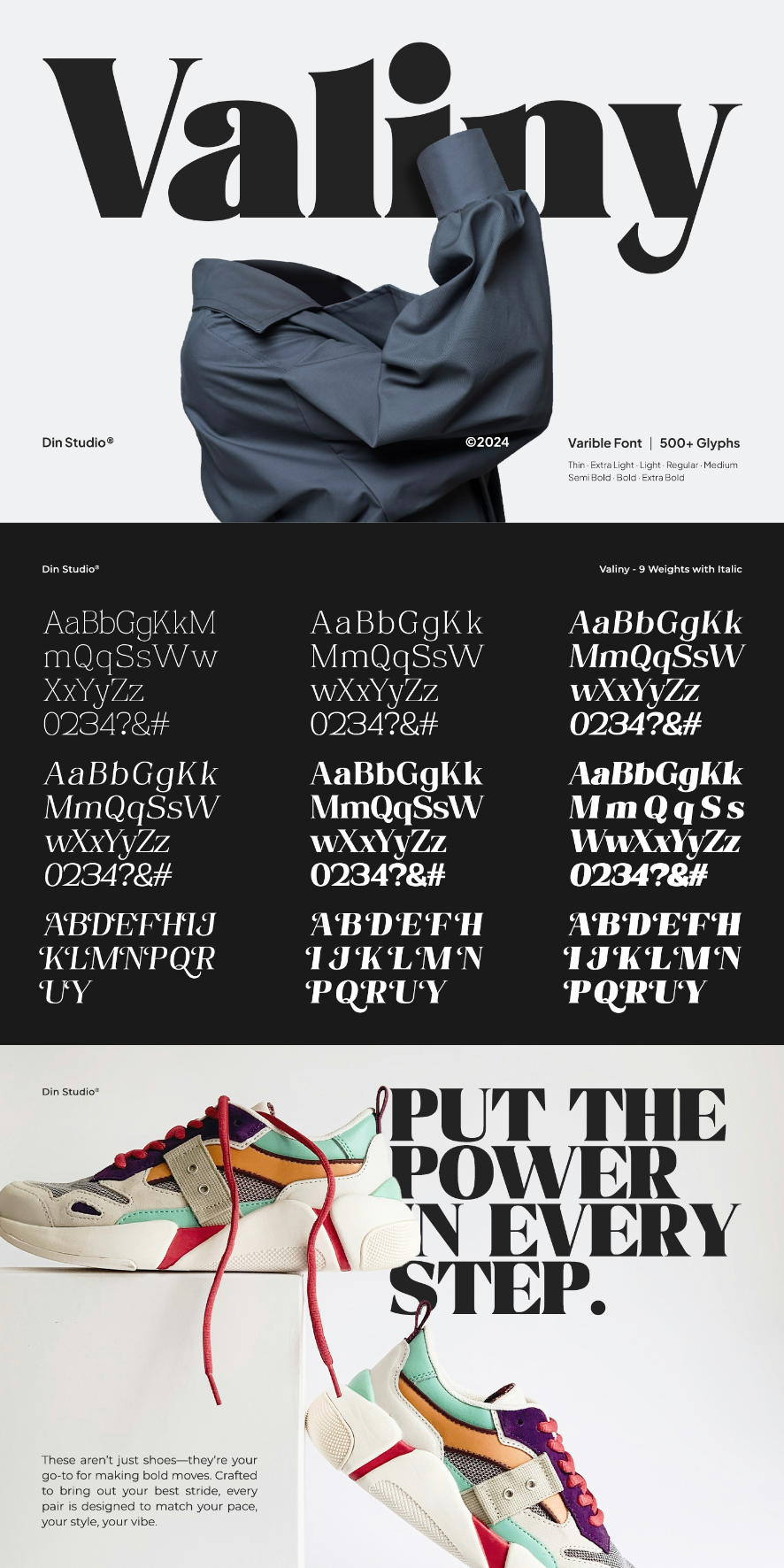 Introducing Valiny, a sophisticated serif font family designed to elevate your creative projects. With 9 distinct weights and an elegant Italic version, Valiny combines timeless elegance, modern flair, and unwavering strength. Its harmonious proportions and refined details make it more versatile. Valiny’s versatility ensures that every letterform speaks with confidence and sophistication, giving your designs a polished, professional edge.