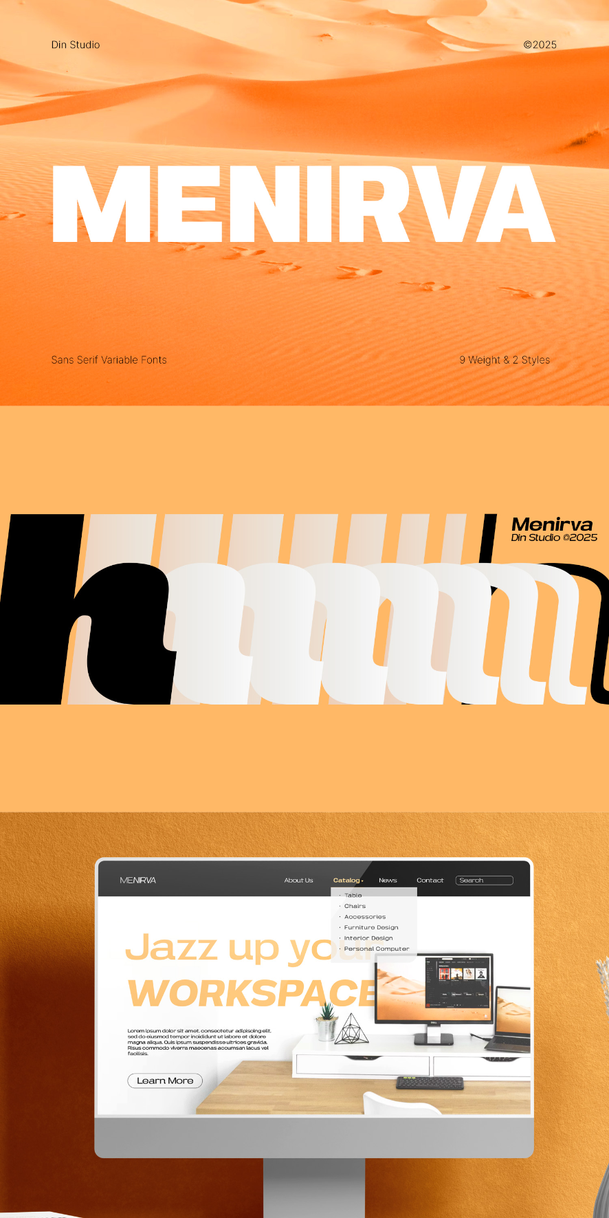 Menirva fits in bold branding, packaging, posters, headlines, editorial designs, and many more designs. Find out more ways to use this font by taking a look at the font preview.
