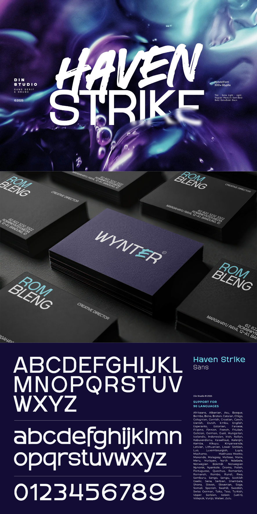 Haven Strike fits in name cards, branding, packaging, posters, headlines, editorial designs, and many more designs. Find out more ways to use this font by taking a look at the font preview.