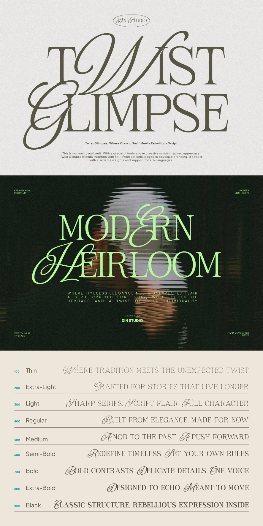 Twist Glimpse is a sophisticated font duo that beautifully blends the classic strength of a serif typeface with the graceful flow of script. Designed to embody timeless elegance and modern versatility, this duo offers a perfect balance between structure and style—making it ideal for designers who want to create luxurious, polished, and memorable visuals. This font becomes more special with 9 weight options. In addition, enjoy the features here.
