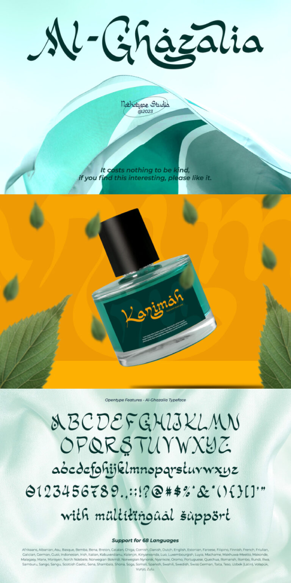 Al-Ghazalia is an exquisite font meticulously crafted to capture the essence of Arabic calligraphy. Al-Ghazalia is not just a font; it’s a bridge between tradition and modernity. The characters in Al-Ghazalia embrace the rich tradition of Arabic lettering, featuring graceful, curvaceous lines and a stunning high-contrast design. Each letter is thoughtfully shaped, exhibiting the intricate beauty of Arabic calligraphy while adding a contemporary touch. In addition, you can also enjoy the features here.