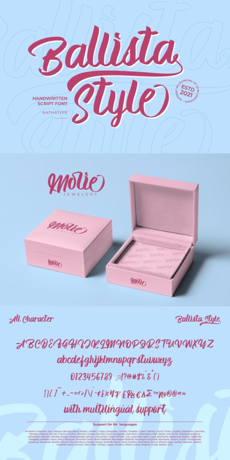 The swinging ends add a touch of movement and flair to the font, giving it a sense of energy and spontaneity. What sets Ballista Style apart is its thick weight, which adds to its bold and confident appearance. In addition, enjoy the features here.