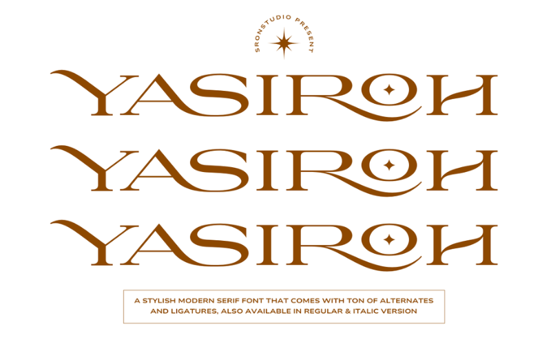 Introducing “Yasiroh,” a modern ligature serif font that exudes elegance and sophistication. With its beautifully crafted ligatures and refined serifs, “Yasiroh” brings a touch of luxury and contemporary flair to any design project. Perfect for logos, invitations, branding, and editorial design, this font offers a harmonious blend of modern aesthetics and classic charm. Elevate your creations with the stylish and graceful appeal of “Yasiroh.”