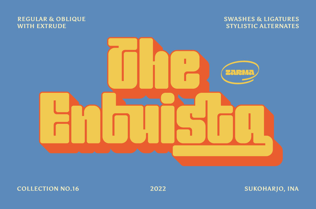 Introducing Entuista, a squary and chunky typeface with a touch of unique retro style. It has 2 style font, regular and oblique with extra extruded font version on each style. So you won’t need extra effort for create an extrude effect for this fonts, that means it will save your precious time to make amazing stand out designs.