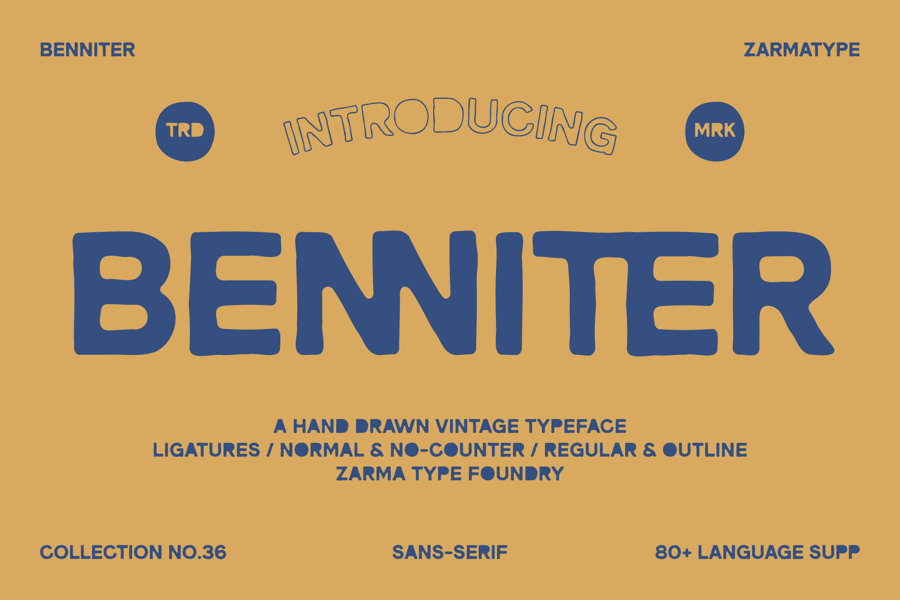 Benniter comes with bunch of unique ligatures and no counter letters available in lowercase, ensuring enhanced usability. It has OpenType features and an Extended Latin character set boasting over 400+ glyphs covering more than 85 languages., broadening its appeal for global projects. Ideal for branding, vintage posters, and any creative venture, Rough Hand Drawn Font Benniter is timeless and vintage appeal is perfect for designers seeking to create eye-catching, nostalgic designs.