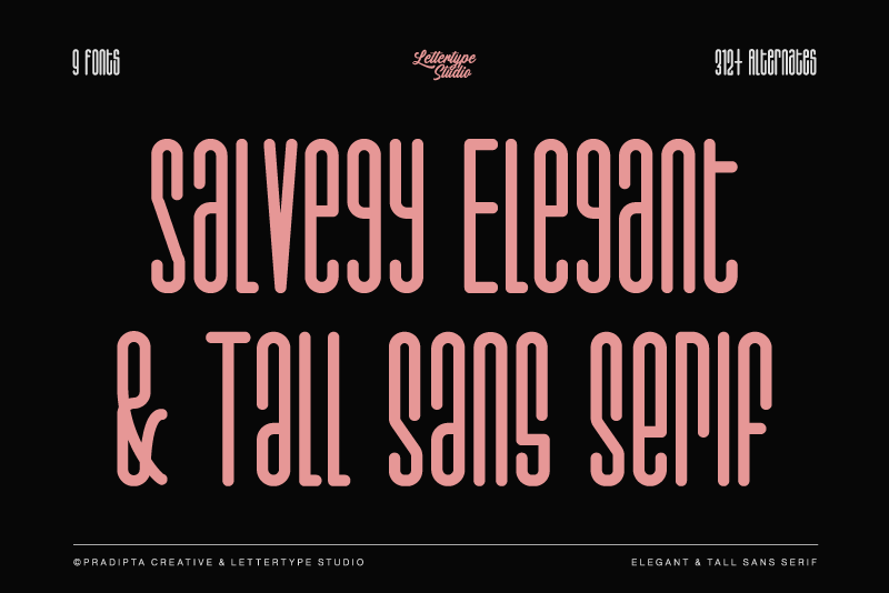 Salvegy is a sophisticated choice for designers looking to create modern, clean, and impactful designs. These fonts are characterized by their extended height and slim, refined appearance, making them perfect for high-end branding, editorial layouts, and minimalist designs. The tall and narrow form adds a touch of elegance and professionalism, ensuring that your text stands out with clarity and style. Ideal for headlines, logos, and web design, these fonts blend seamlessly into various creative projects, offering both versatility and a distinctive aesthetic appeal.