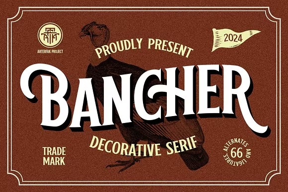 Introducing “Banchers,” a vintage-inspired serif font with a wealth of alternate characters. Bold and unique serif condensed, this font blends the charm of classic handcrafted typography with a modern, elegant touch.
