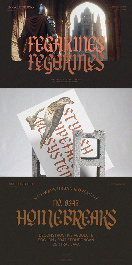 NCL FEGAKINES is is a fun, unique, stylish and modern blackletter display font. Masterfully designed to become a true favorite, this font has the potential to bring each of your creative ideas to the highest level! It was purposely crafted to be used in large point sizes, although it doesn’t lose its magic in small point sizes. It is perfect for headline, billboard, magazines, website, titles, poster, branding, and logos. No matter the topic, this font will be an incredible asset to your fonts’ library, as it has the potential to elevate any creation. With this beautiful font, absolutely you can make your project stand out from the rest. See the previews above to get some inspiration on how to use them.