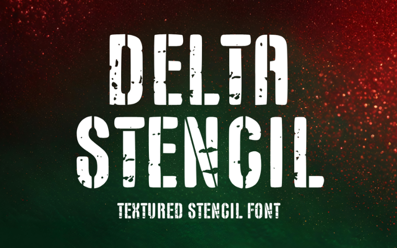 Delta Stencil is a rugged and textured stencil font that exudes strength and versatility. Its bold, military-inspired design with distressed details makes it perfect for posters, logos, packaging, and projects that need a tough and industrial vibe. Stand out with Delta Stencil!