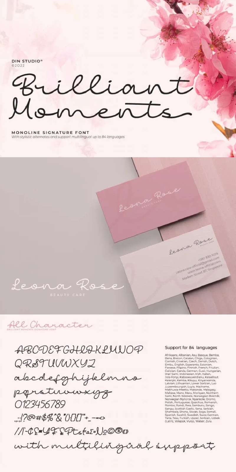 Brilliant Moments. It is a script font that is a handwriting-like script font involving strokes and angles. This font works perfectly for both bigger- and smaller-sized texts. Besides, it has interesting features to help you maximize your designs.