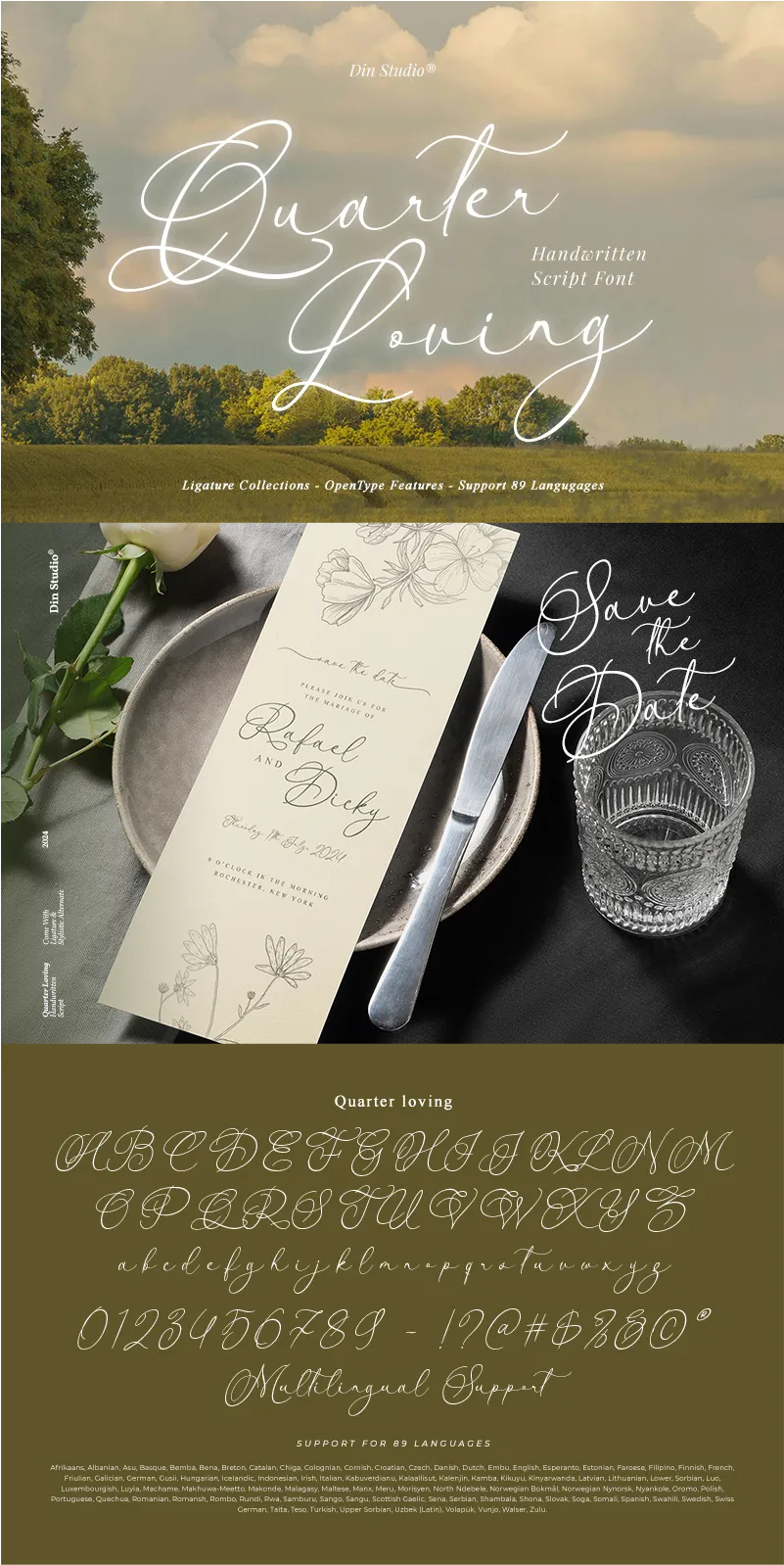 Quarter Loving is a whimsical handwritten font that infuses your designs with charm and character. With its thin weight and connected letters, this font flows beautifully, creating a seamless script. The inconsistent letter proportions and playful swinging ends give it a unique, lively appearance.