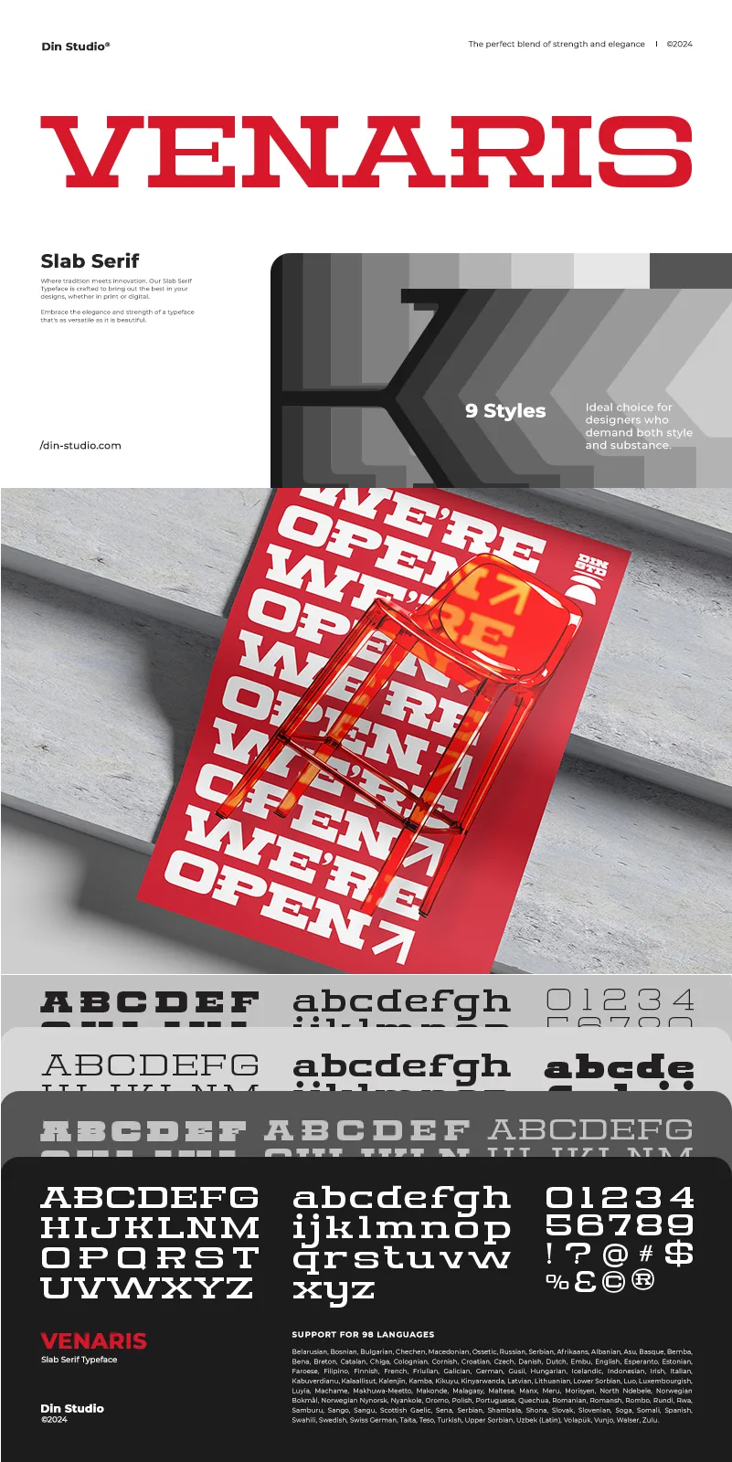 Venaris-a sophisticated slab serif font family that embodies modern elegance. Crafted in 9 distinct weights, Venaris offers versatility and refinement for a wide range of design projects. Its clean lines and balanced proportions provide a contemporary aesthetic, while the robust slab serifs add a touch of timeless strength.