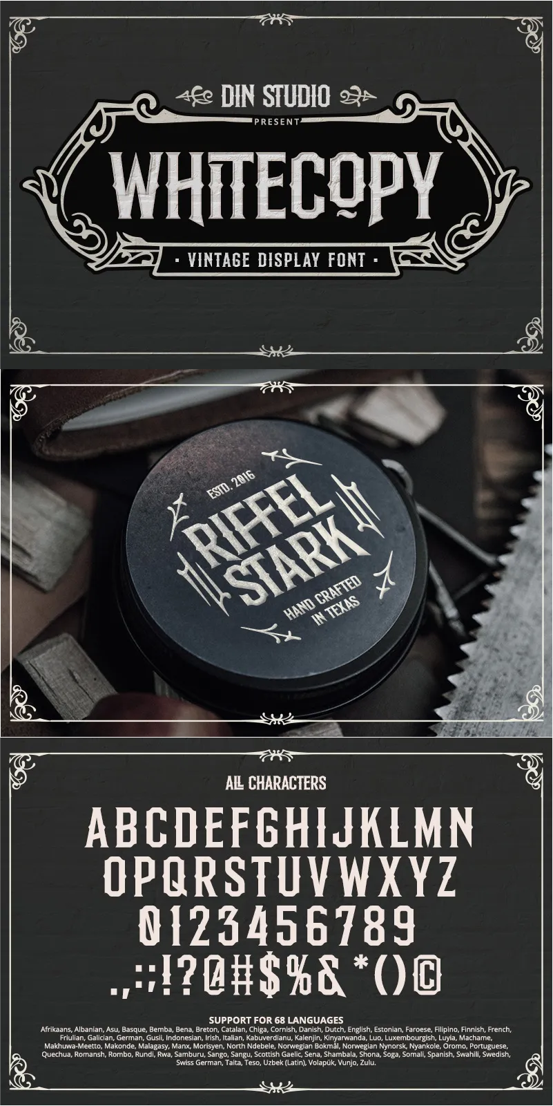 Whitecopy – a vintage display font that blends boldness with classic charm. Crafted in uppercase with a substantial thickness, Whitecopy makes a powerful statement while maintaining an air of sophistication. The consistent letter proportions ensure a harmonious and cohesive look, while the subtly ornamented outline adds a touch of intricate detail, enhancing its vintage appeal. As an extra, this font gives ornaments.
