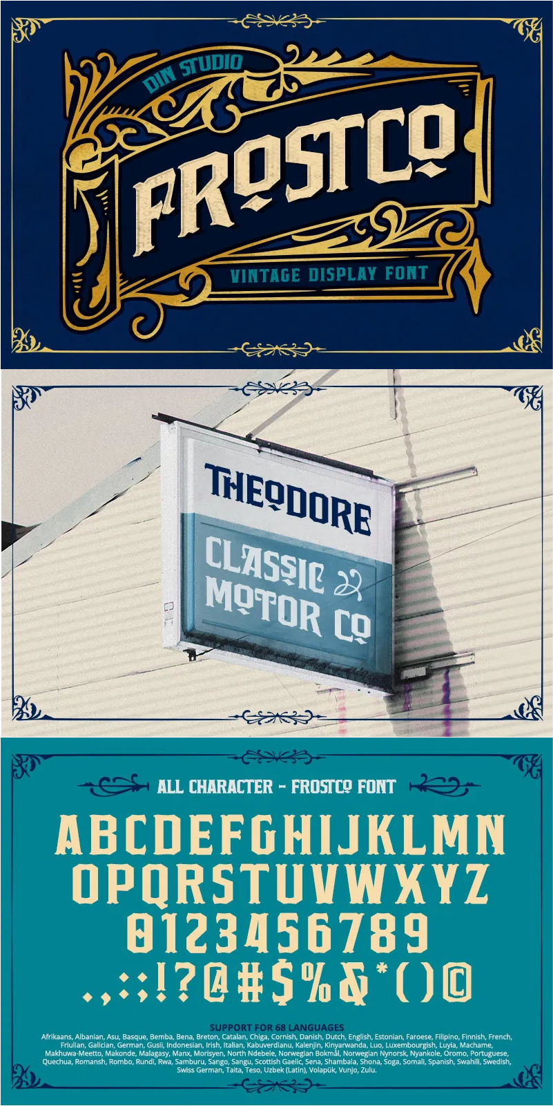 Frostco – a bold, vintage-style display font that captures attention with its rugged charm. Crafted in all caps with a strong, bold weight, Frostco stands out with its distinctive outline, which is made in subtle curves and irregularities instead of straight lines. This unique touch adds an authentic, handcrafted feel, perfect for retro-inspired vibes. As an extra, this font gives ornaments.