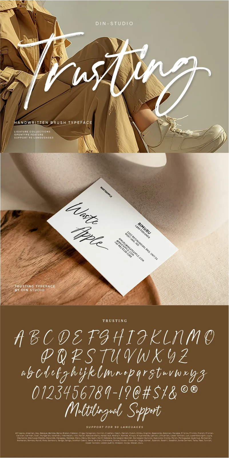 Trusting, a beautifully crafted handwritten script font with captivating brush details that command attention. Every stroke is designed to evoke authenticity and charm, making it perfect for adding a personal, artistic touch to your projects. Elevate your designs with this eye-catching font and let its bold, brush-inspired style draw buyers in with every glance.