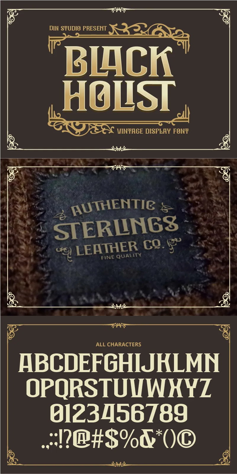 Black Holist, a bold and captivating display font that brings vintage charm to the forefront. Designed in all uppercase letters with a thick, sturdy weight, Black Holist offers both strength and style in perfect balance. Each letter is crafted with consistent proportions, ensuring excellent readability even at larger sizes. Whether you’re aiming for a retro aesthetic or a timeless design, Black Holist adds an unmistakable vintage flair to any project. This font gives ornaments as extra.