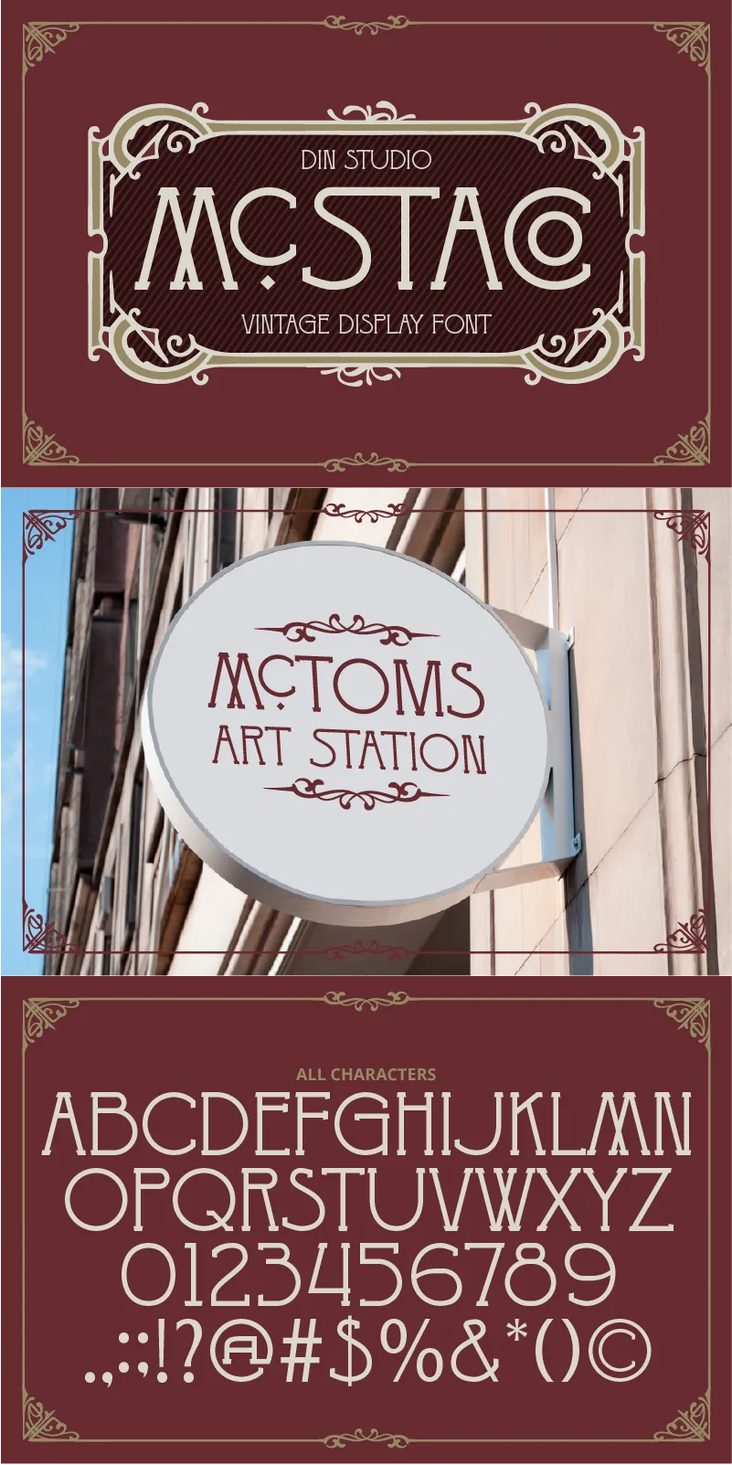 Mcstaco, a sleek and elegant display font with a vintage flair. Crafted in uppercases, Mcstaco shows a refined, thin weight that brings a touch of sophistication to any project. The consistent and clean letterforms, combined with softly rounded shapes, create a smooth and approachable feel. With its timeless vintage style and delicate design, Mcstaco adds a subtle yet striking charm to your creations. This font gives ornament sets as extra.