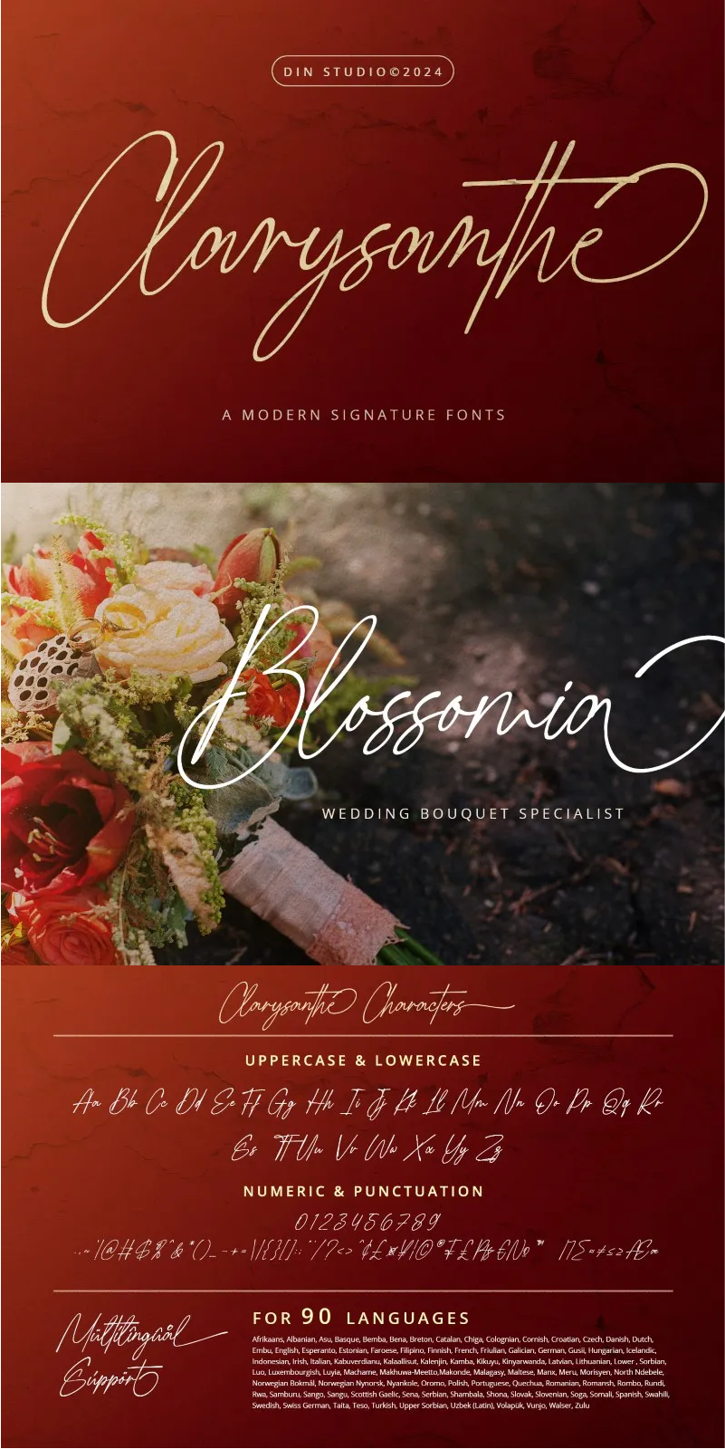 Clarysanthe is a graceful script font designed in an elegant signature style, made in connected letters with charming swinging ends. With its low contrast and balanced, consistent letter proportions, Clarysanthe exudes sophistication and fluidity. Let your designs flow effortlessly with the timeless charm of Clarysanthe.