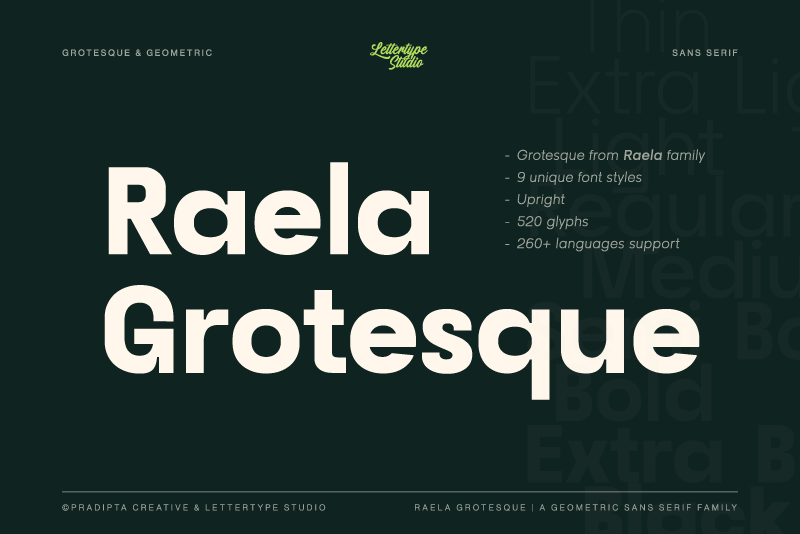 Raela Grotesque seamlessly blends geometric shapes' clean, modern elegance with the timeless appeal of Grotesque design principles. Designed for readability and versatility, its proportional width, flat apex, closed aperture, and straight-cut stroke ends enhance its contemporary appeal with a bold and strong personality.