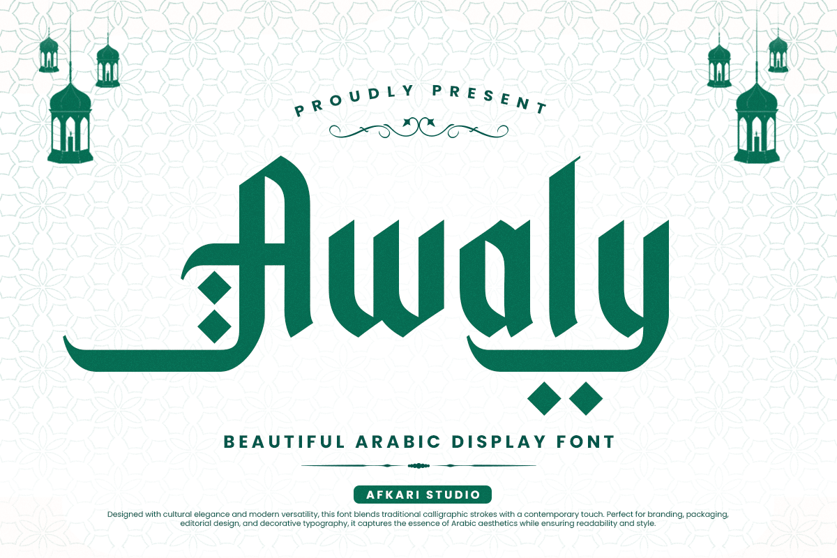Awaly is a beautifully crafted Arabic-style typeface that blends traditional calligraphic elegance with modern versatility. Designed to capture the fluidity and grace of Arabic letterforms, this font is perfect for branding, packaging, headlines, posters, and Islamic designs.