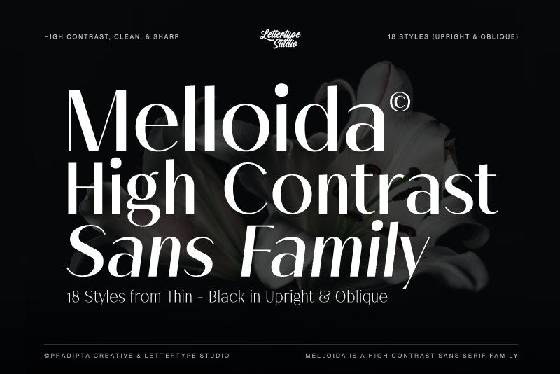 Melloida is a high-contrast sans serif font family. These typefaces combine clean lines with striking contrast, blend sharp geometric precision with refined stroke variations, and offer a modern yet timeless aesthetic. Ideal for branding, editorial layouts, and digital interfaces, they provide versatility and clarity across various applications. Whether you're crafting a minimalist logo or an engaging website, these fonts deliver both functionality and style.