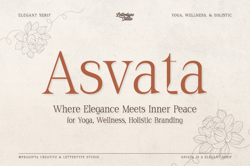 Asvata is a timeless serif font with organic curves, refined contrast, and a tranquil presence. Rooted in elegance and spiritual depth, Asvata is perfect for wellness branding, yoga studios, holistic product packaging, and mindful design. Its graceful letterforms evoke balance, clarity, and connection, offering a soft yet professional voice across editorial, logo, and digital projects.