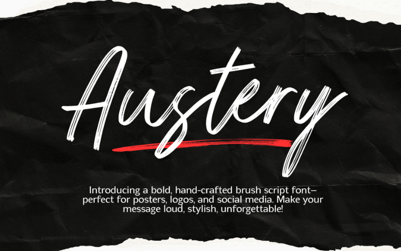 Austery Brush is a bold and expressive script brush font that blends raw energy with elegant strokes. Handcrafted with a textured brush style, this font is perfect for logos, branding, posters, apparel, and creative headlines. Its dynamic flow and natural imperfections give your designs a personal, artistic touch — ideal for those who want to stand out with style and attitude.