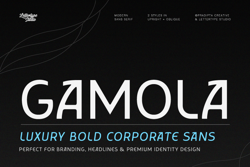 Gamola is available in two styles: Upright and Oblique, offering flexibility for different design moods and layouts. It features full uppercase and lowercase letters, numbers, punctuation, and multilingual support with accented characters. Designed for professional use, Gamola is a sleek, modern sans serif font that elevates your brand presence.