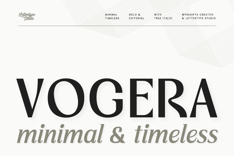 Vogera is a minimalist, timeless editorial serif with subtle sans serif influences, crafted for modern branding, magazines, and creative projects. Its refined letterforms combine understated serifs with clean proportions, striking the perfect balance between tradition and modernity. This makes Vogera a versatile choice for designers seeking sophistication without excess, perfect for high-end identities, fashion campaigns, and editorial layouts.